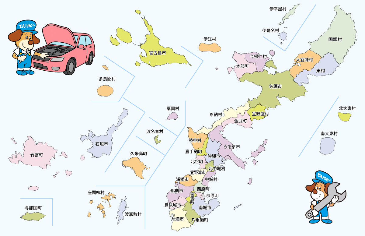 | 与那国 (よなぐに) | 581 | 米浜自動車整備工場 | 字与那国437-8 | 0980-87-2148 | 民間車検場 |